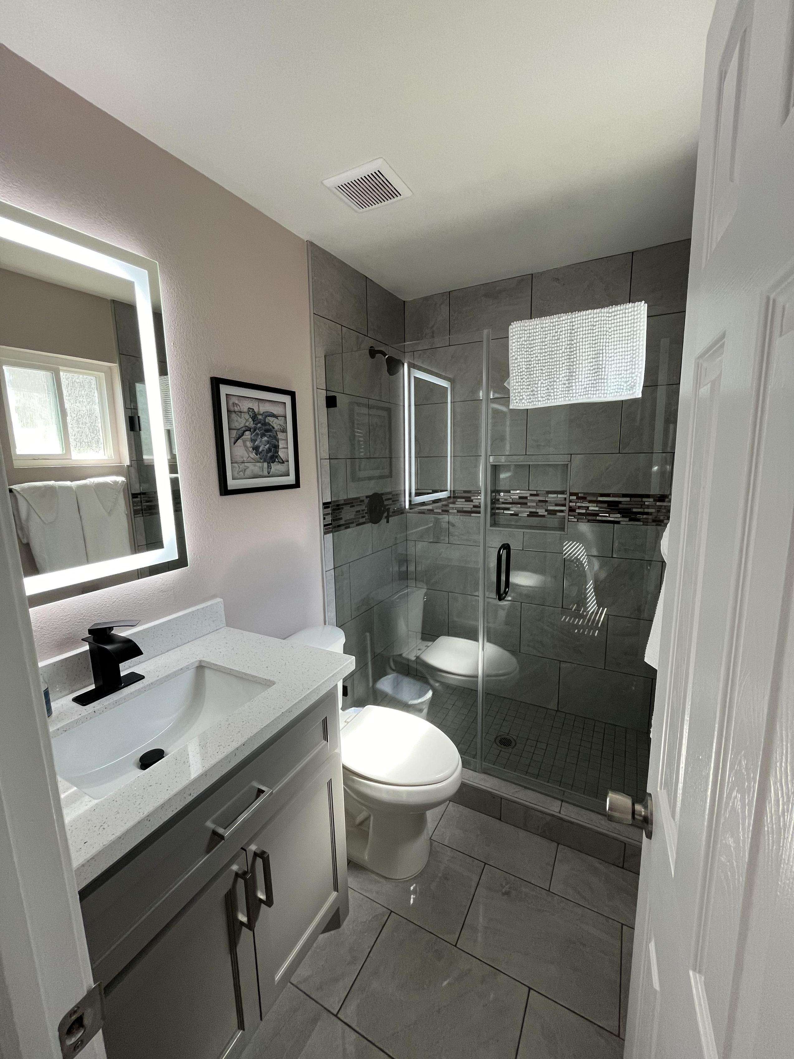 This 3 bedroom/2 bath unit is set up to accommodate up to 7 people. Offering : ·Kitchen complete with pots, pans, dishes, a full-size stove, microwave and refrigerator ·Dishwasher ·Fully furnished (including 1 king, 1 Queen, and a bunk that includes 1 double and 1 single bed) ·Covered front porch for some shade and a large sunny back deck off the master bedroom ·Free Washer & dryer access (bring your detergent) ·Free parking ·Central air, laminate floors ·Satellite TV ·Free Wireless Internet